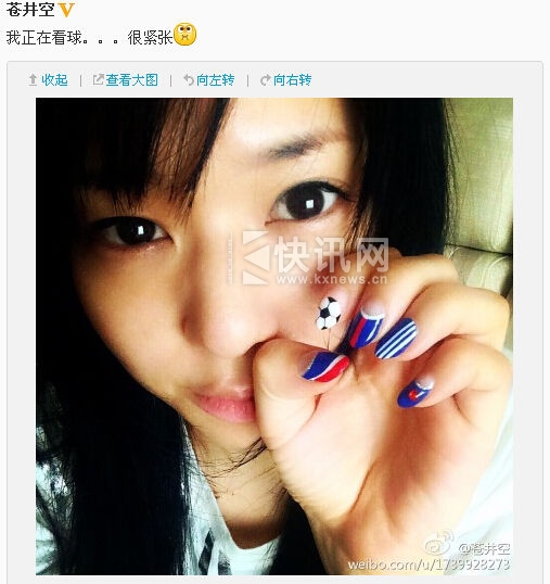 网曝苍井空曾发 为日本队加油助威。综合日本球员长友佑都在球赛打到一半时拉开裤裆“视察”的一幕,网友戏称:别找那蚯蚓了,今晚苍老师不会过来慰劳你们的了,谁让你们输球了?惹得苍老师都要借酒消愁!