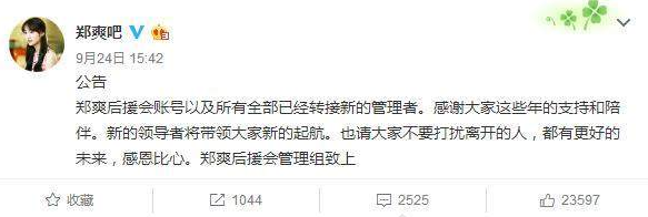 当时的管理员也用贴吧账号发布消息称“郑爽后援会账号以及所有已经转接新管理者。”