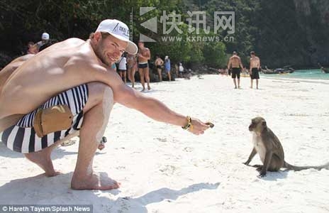 猴湾是以当地的猴子命名的。凯南心情大好,顺手给海滩上的猴子喂食。小猴颇通人性,似乎觉得盛情难却,勇敢地上前取食。喜欢动物的他还抽空和朋友一起去看了当地的一些流浪狗。此外,凯南明年会作为一名特邀嘉宾,返回泰国尼基海滩庆祝他的29岁生日。