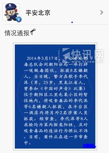 平安北京发布 称:2014年3月17日,市公安局禁毒总队会同朝阳分局一举打掉一吸贩毒团伙,抓获8名嫌疑人。当日晚,警方在歌手李代沫(男,25岁, 黑龙 江省人,曾参加《 中国 好声音》比赛)位于朝阳区三里屯某小区的暂住地内,将吸食毒品的李代沫等6名嫌疑人抓获,在丰台区一酒店内将另外2名涉案人员抓获。经审查,李代沫等8人尿检均为苯丙胺类阳性,且对吸食毒品的违法行为供认不讳。目前,案件正在进一步审查中。
