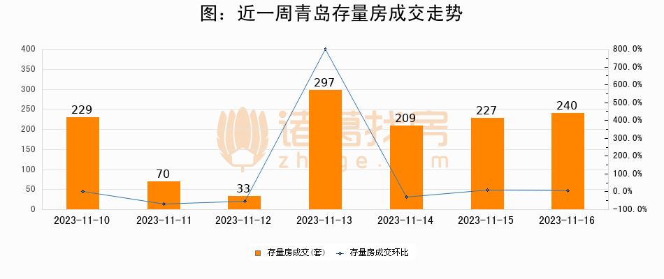 从存量房来看,2023年11月16日青岛存量房单日成交240套,比昨日增加13套,环比上涨5.7%。从近一周存量房成交来看,青岛存量房日均成交套数为186套,11月16日单日成交240套,高于近一周平均水平29%。