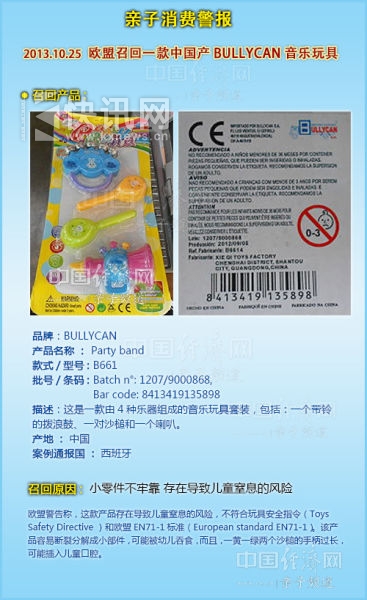 中国经济网11月14日讯 10月25日,欧盟“非食品类消费品快速预警系统”发布2013年第42周通报。一款中国产“BULLYCAN”品牌的音乐玩具套装,因小零件不牢靠等问题,遭欧盟警告存在窒息风险。问题通报国西班牙已采取将产品撤出市场的强制性措施。