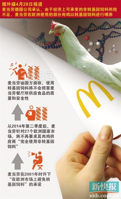 近日,有德国媒体报道称,从2001年开始,麦当劳一直承诺,在欧洲市场上销售的鸡块和鸡肉汉堡产品,其原料肉鸡的饲养过程中不会使用转基因饲料。然而,麦当劳德国公司的一名发言人近日表示,自4月初以来,麦当劳允许其鸡肉供应商使用转基因饲料。