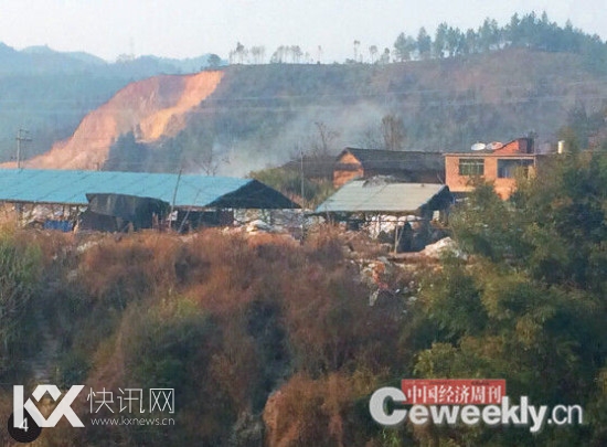 进入山坳,在茂密的树林里,隐约可见一些蓝色厂房房顶和简易的堆放原料的大棚。一个山坡上,一家生产塑料制品的化工厂正在紧张生产中。一名村民告诉记者,这家工厂叫“宏达塑料厂”,已经成立三年多了。