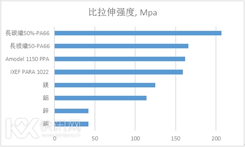 图1(数据由第一基石(www.first-foundation.com)提供):几种代金属塑料与金属抗拉强度及比重的比较。