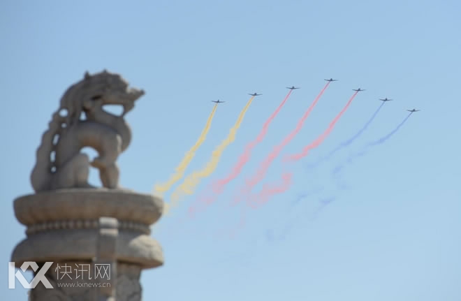 空中护旗方队与国旗军旗编队飞过天安门广场