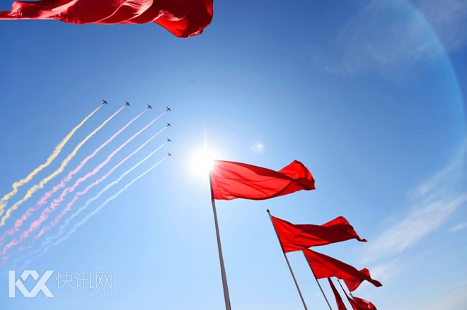 空中护旗方队与国旗军旗编队飞过天安门广场