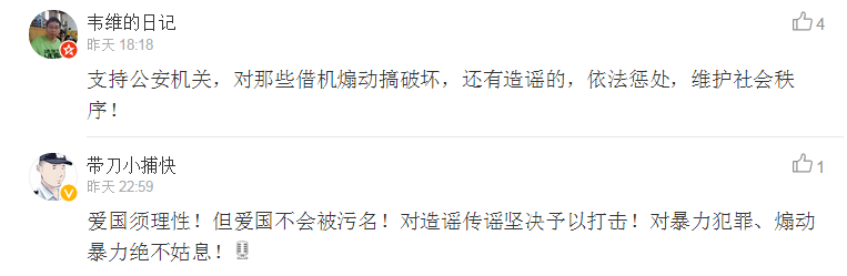 网友在微博下留言,“支持公安机关,对那些借机煽动搞破坏,还有造谣的,依法惩处,维护社会秩序!”“爱国需理性!但爱国不会被污名!对造谣传谣坚决予以打击!”,更有网友为警方点赞,“赞启东警方,不能都这么愚蠢”。