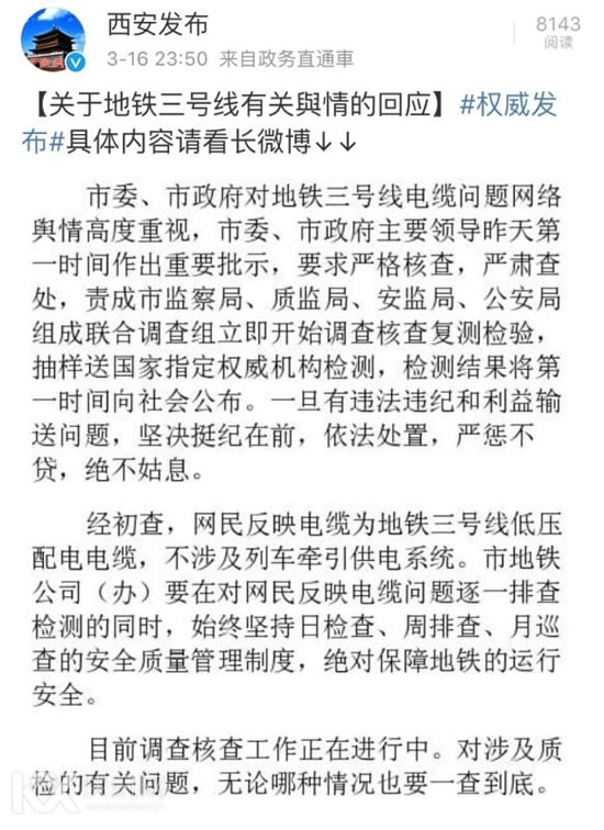 澎湃新闻(www.thepaper.cn)注意到,继涉事电缆公司及西安地铁公司相继回应舆情后,西安市政府也于3月17日23点50分通过微博及微信公众号发声。回应称,经初查,网民反映电缆为地铁三号线低压配电电缆,不涉及列车牵引供电系统。