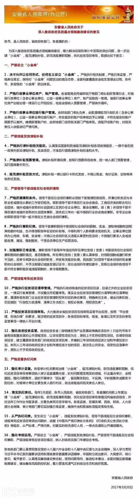 安徽省政府近日出台《关于深入推进政府系统重点领域廉政建设的意见》,从进一步治理“小金库”,规范津贴补贴,防范违规兼职取酬,优化投资项目审批等五大方面提出十六条具体意见。