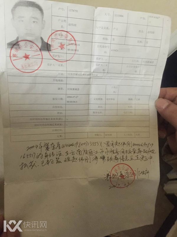 赵伟刚手中的证明是他的户籍信息,下方写有一行小字:“2004年冀魁星(41042619800713553x)冒用赵伟刚(410426197809165517)的身份证,在云南省丽江市永胜县贩卖毒品被抓获,已枪毙。现赵伟刚涉嫌贩毒信息正在更正中。”