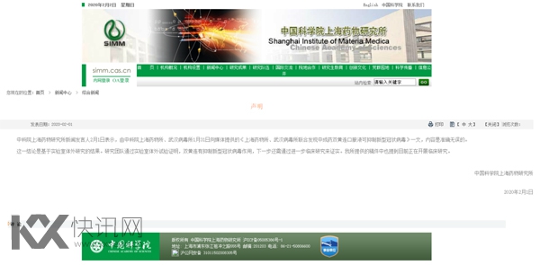 中国网2月2日讯 中科院上海药物研究所在其官网发布声明称,中科院上海药物研究所新闻发言人2月1日表示,由中科院上海药物所、武汉病毒所1月31日向媒体提供的《上海药物所、武汉病毒所联合发现中成药双黄连口服液可抑制新型冠状病毒》一文,内容是准确无误的。