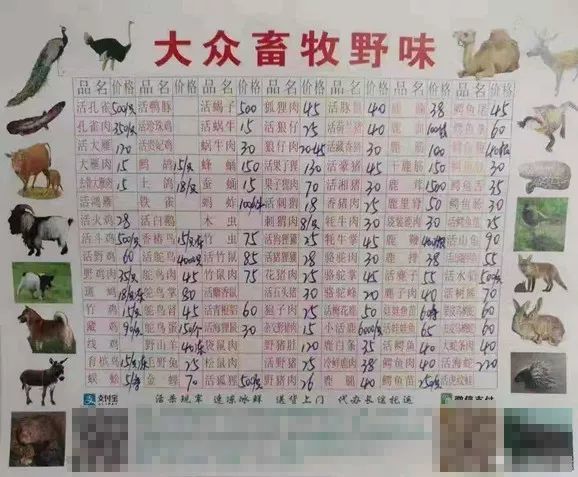 在他们这样一份报价单,我们就可以看到,吃一种活孔雀只要500元,吃一只活大雁只要170元,甚至上面还有活果子狸吃,售价130元。