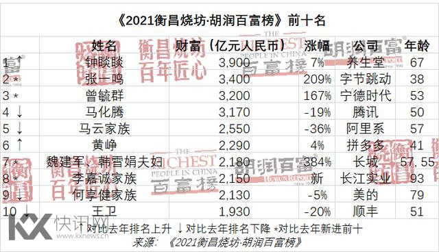 值得注意的是,首次进入排名前十的有:今日头条的张一鸣、宁德时代的曾毓群、长城汽车的魏建军、韩雪娟夫妇和长江实业的李嘉诚家族。前十名门槛为1,930亿元,比去年的2,000亿元下降70亿元。前十名平均年龄58岁,比去年年长4岁。